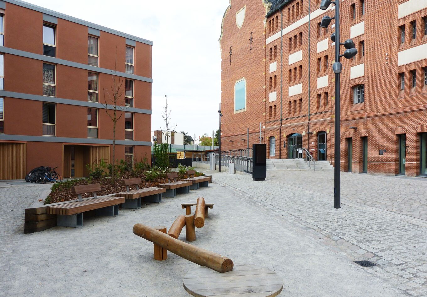 Unser Büro plante den Freiraum, zunächst unmittelbar um die Alte Mälzerei. Später folgten die Außenanlagen des gesamten Quartiers, dessen Mittelpunkt die Alte Mälzerei bildet.